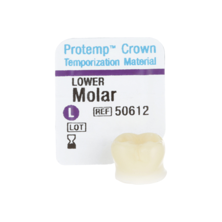 Single unit, self-supporting, malleable and light-curable composite crown. With its preformed anatomy, precision fit and excellent strength, this material is a innovative temporisation solution for single posterior units and ideal in situations where fabricating a matrix is not possible. Suggested applications include Single unit posterior temporisation, long-term temporisation, implant temporisation and digital impression-taking. Refill Kit includes Biscuspid (Premolar) Lower Temporary Crowns x 5, Instructions and Crown Size Tool.