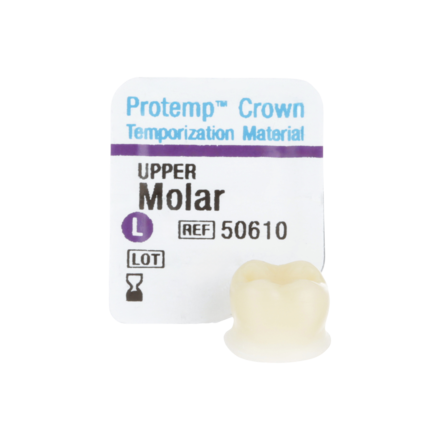 Single unit, self-supporting, malleable and light-curable composite crown. With its preformed anatomy, precision fit and excellent strength, this material is a innovative temporisation solution for single posterior units and ideal in situations where fabricating a matrix is not possible. Suggested applications include Single unit posterior temporisation, long-term temporisation, implant temporisation and digital impression-taking. Refill Kit includes Biscuspid (Premolar) Lower Temporary Crowns x 5, Instructions and Crown Size Tool.