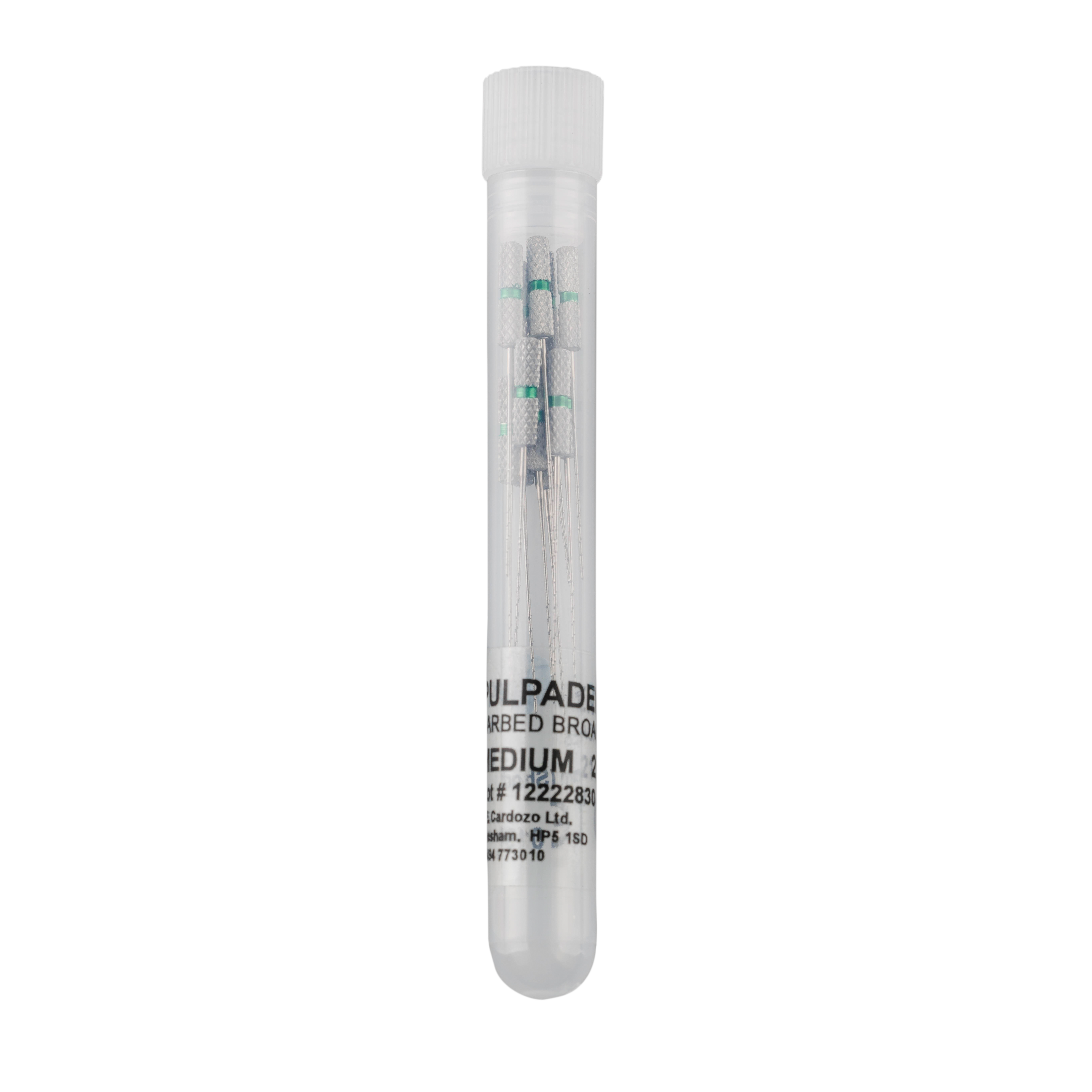 Stainless steel barbed broaches short 21mm, with colour coded handle.