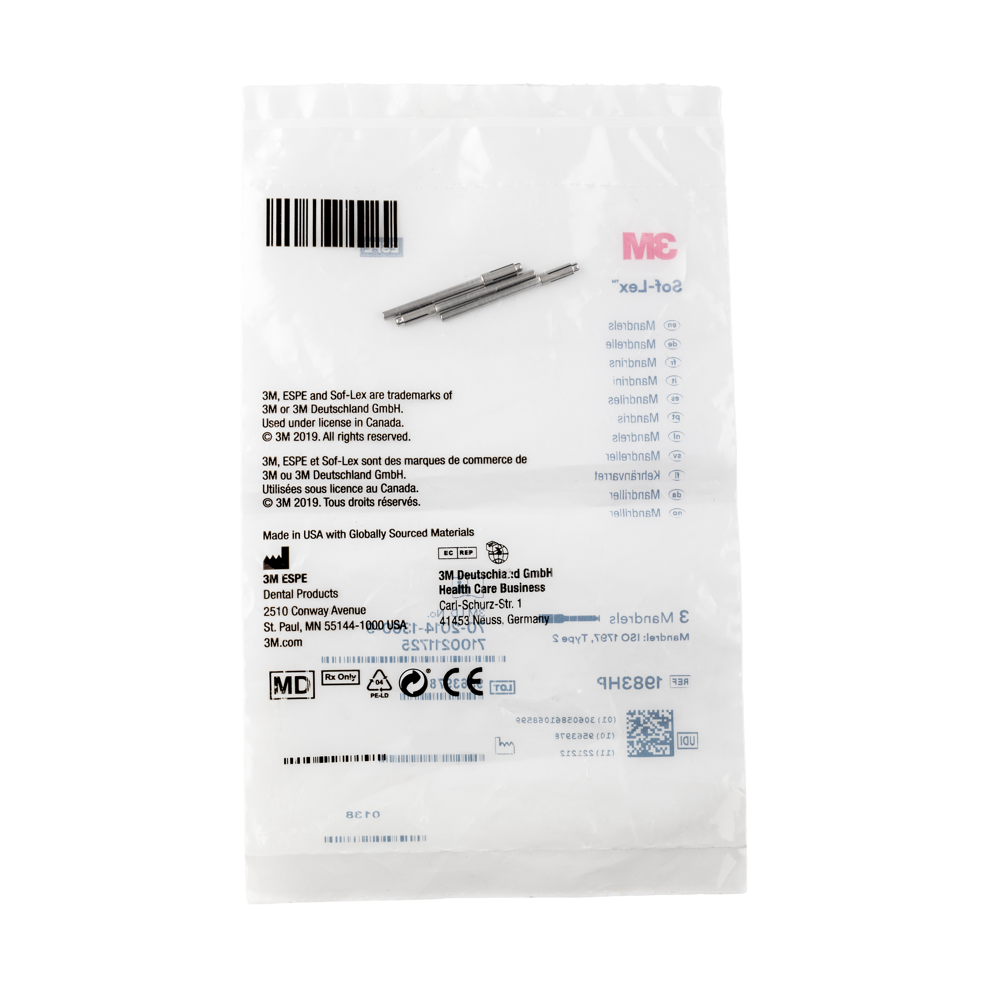Straight-attachment, pop-on mandrel for use with Sof-Lex Finishing and Polishing Discs and Sof-Lex Extra-Thin Finishing and Polishing Discs. Low profile; designed to reduce risk of marring the restoration.