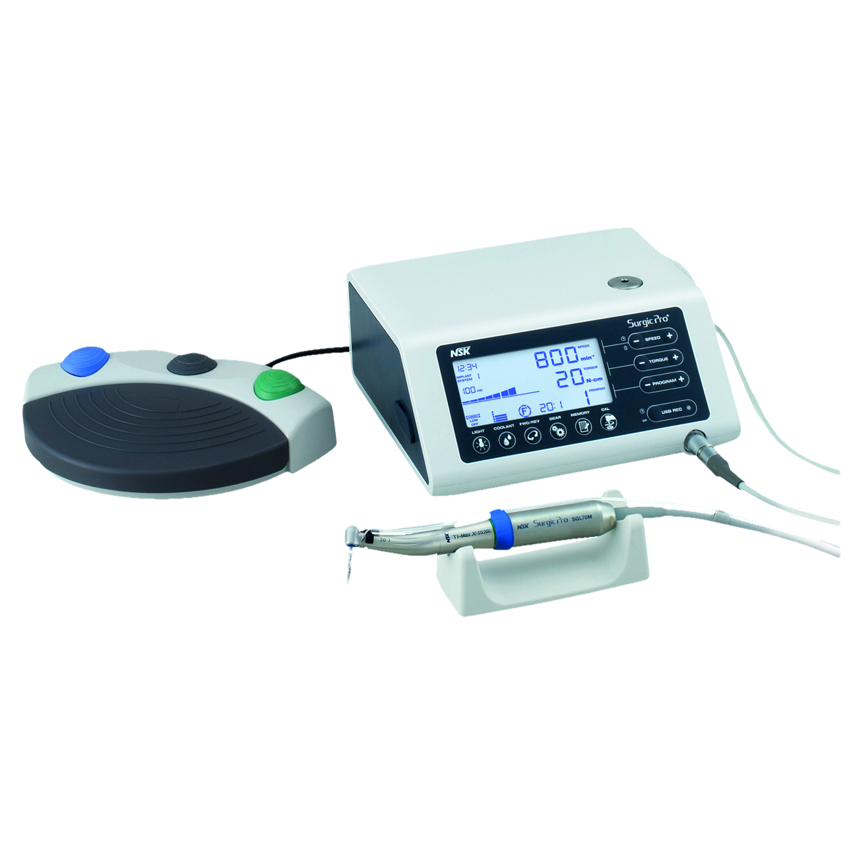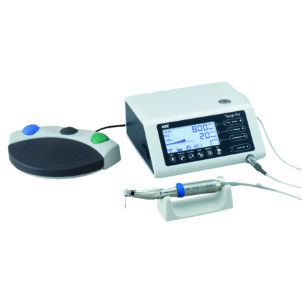 Compact, fully integrated surgical micromotor system with AHC (Advanced Handpiece Calibration) that guarantees accurate speed and torque. Surgic Pro is preprogrammed with memories of 6 major brand implant systems. Each program includes speed, torque, coolant flow and rotational direction. New programs are memorised simply by pressing the memory key. During operation, the backlight LCD offers immediate recognition of all operating parameters. The control design logic, at both the system centre and the foot control, allows clinical focus to be maintained during complex procedures. LED illumination over 32,000 LUX. Powerful torque of up to 80N/cm. Wide speed range of 200-40,000rpm. Handpiece suitable for washer disinfectors and autoclaves. Dimensions: (W)268 x (H)100 x (D)220mm.