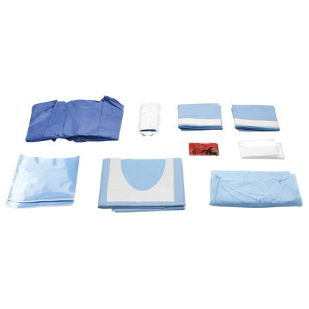 SMS Microfibre gown Expo model SMS - Size L x1, Water-repellent gown with cotton cuffs - Non-woven x1, Drape with U cut -non-woven fabric/polyethylene 100×150cm x1, Rectangular drape with adhesive - non woven fabric/polyethylene 75×90cm x 2, Tubing sleeve with fixing elastics 120×7cm x1, Adhesive film x 2, +Transparent drape with adhesive 40×50cm x1, Bag for contaminated material x1