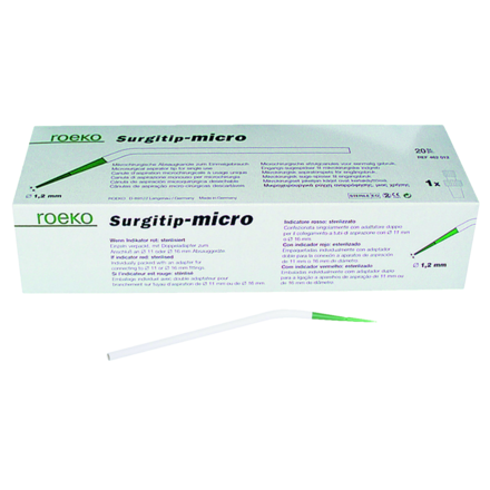 Surgitip-micro is specially designed for use with microscopes and loupes. The extra fine tip-opening of 1.2 mm ensures precise aspiration without blocking the field of vision. Surgitip-micro is sterile and ready for use in peel packs. Includes 1 Double Adaptor for ° 11 mm and ° 16 mm equipment.