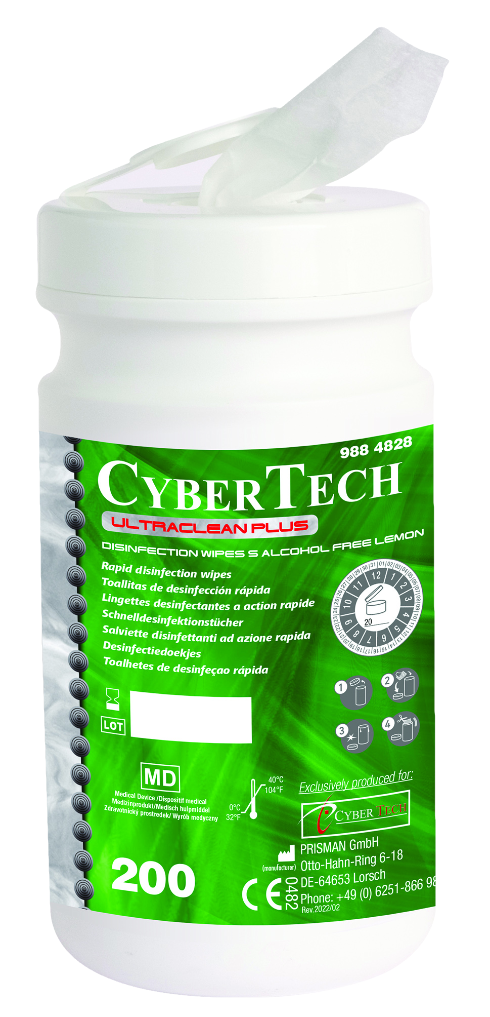 Alcohol-free surface disinfectant wipes suitable for use on alcohol-sensitive surfaces. Broad spectrum of efficacy against bacteria, yeasts and viruses. Ready-to-use pH-neutral formula. Dries virtually residue-free. Contact time: bacteria and Candida albicans - EN13727, EN13624, EN1276, EN1650, EN13697 (dirty): 2 min; enveloped viruses (HBV, HIV, HCV) - EN14476 (RKI/DVV dirty): 1 min; rotaviruses - EN14476 (clean): 1 min; noroviruses - EN14476 (clean) 30 mins; polyoma SV40 (RKI/DVV dirty): 1 min. Wipe size: 200 x 220mm.