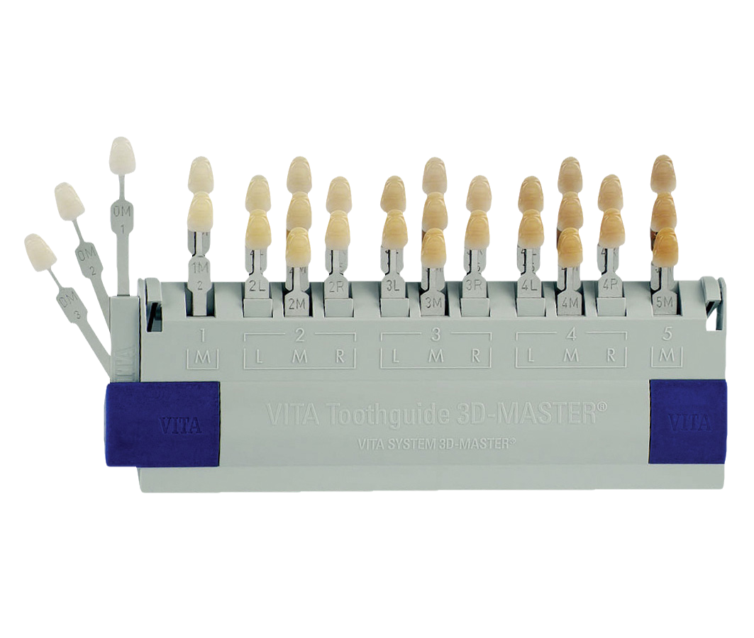 Shading system where all natural tooth shades are systematically determined and completely reproduced. Shades can be mixed therefore giving you a potential of 97 shades to choose from. Shade taking with the VITA Toothguide 3D-MASTER is carried out in three systematic steps which every user can learn easily. VITA materials enable the technician to achieve their target and to avoid time-consuming mixing or shade checks. VITA also offers the materials required for the reconstruction of bleached teeth.