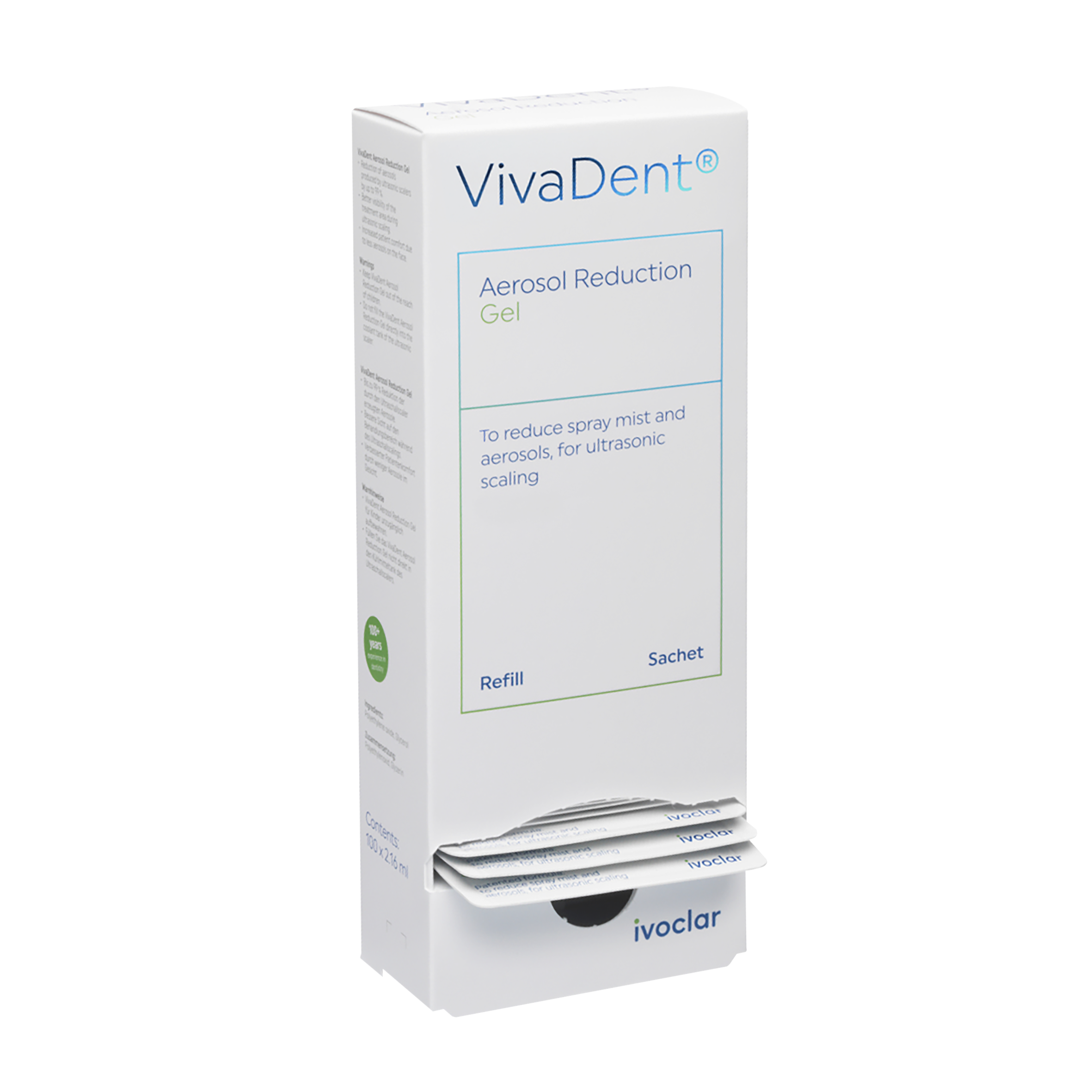 Water-soluble gel that reduces spray mist and aerosols that are produced by ultrasonc scalers. Better visibility of the treatment field during treatment with the ultrasonic scaler, with dental mirrors remaining mostly unaffected from water spray. More protection as the likelihood of spreading airborne diseases and cross-contamination is effectively reduced by reducing the spray mist. Provides a more comfortable experience for patients due to less splatter on the face: make-up is nearly unaffected and glasses stay clean. Easy-to-use mix-in solution for all ultrasonic scalers with an external coolant tank. Starter Kit includes Sachets 2.16ml x 100 and Mixing Bottle 1L x 2.