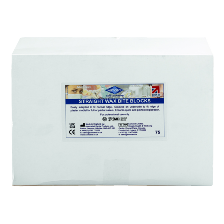 Time-saving occlusal rims for dentists or technicians. Straight blocks are a large size with a curved base to fit the model. Blocks can be easily adapted to shape and carved with a wax knife when warm, and maintain contour when cooled. Using preformed blocks prevents the risk of porosity which may occur when sheets of wax are hand-rolled. Precurved blocks are designed to represent the tooth position and are even quicker to use.