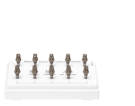 Long-lasting high-gloss polisher system providing a universal solution for all anterior and posterior restorations. Unobtrusive, naturally glossy composite restorations with a long-lasting polish in only 2 steps. Made from silicone and highly filled with micro?ne diamond powder. Autoclavable and reusable.